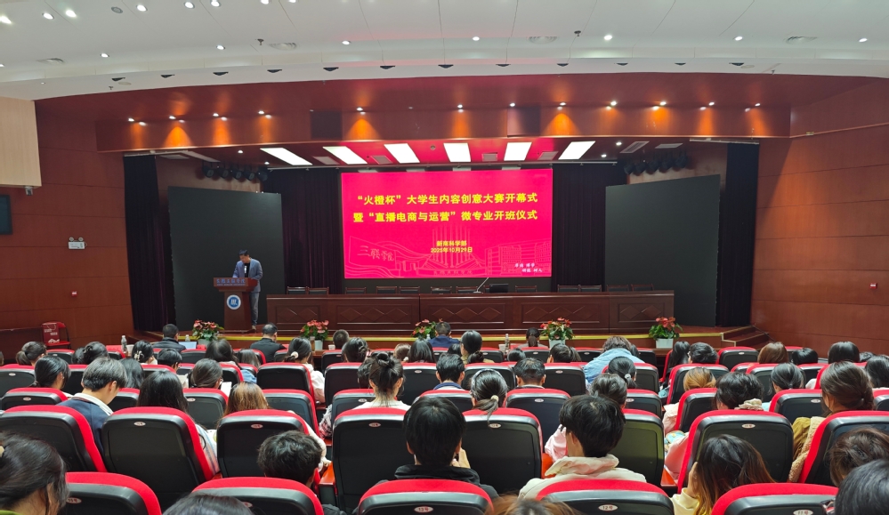 10月29日,“火橙杯”2025年大学生内容创意大赛开幕式暨 “直播电商与运营”微专业开班仪式在学术报告厅举行。合肥火橙电子商务有限公司总经理徐许、财务总监王宝金,安徽三联学院副校长、新商科学部部长傅炜,新商科学部副部长程学华、科研主任郝西文,电子商务专业负责人刘珊珊以及300余名师生代表共同参加。郝西文主持仪式。